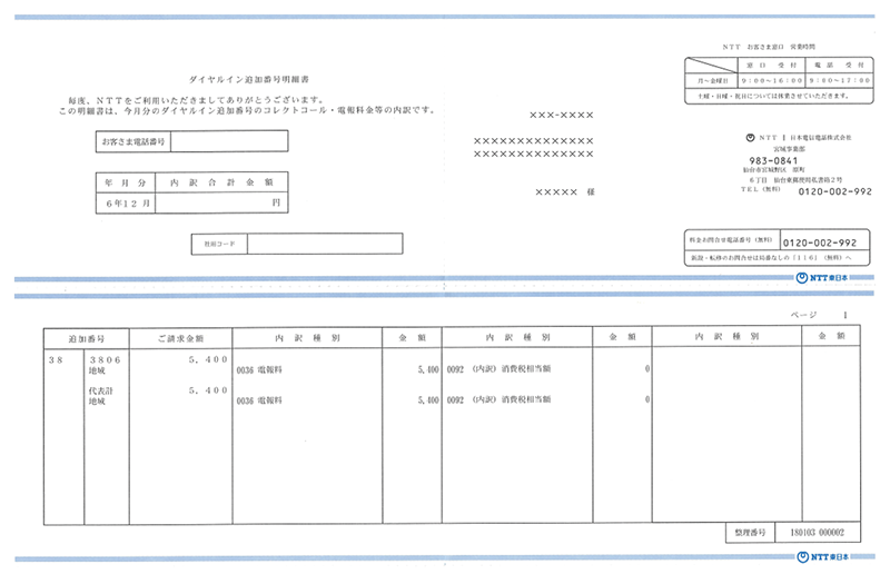 ダイヤルイン追加番号明細書とは、ダイヤルイン追加番号から ご利用いただいた「電報料」をダイヤルイン追加番号単位で記載した明細です。