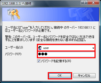 ユーザー名、パスワードを入力し、【OK】ボタンをクリックしてください。ユーザー名 「user」と入力してください。 パスワード パスワード:初期設定で設定したパスワードを入力してください。
