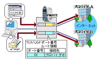 利用するサービス(例えばftpや電子メール)ごとに、接続するインターネットプロバイダを切り替えることができます。本商品は、指定したサービスを受信すると、自動的にインターネットプロバイダを選択し、接続します。このような動作をするためには、「使用するアプリケーションで接続先を選択(TCP/UDPポート番号ルート情報)」にてアプリケーションと接続先の対応を登録し、特定サービスの接続先を指定します。
