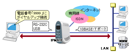 RS-232CポートまたはUSBポートに接続した端末を、10BASE-Tポートに接続した端末のLANに参加させることができます。 これによって、10BASE-Tポートに接続した場合と同じように、インターネットに接続したり、ネットワーク上の資源を利用できるようになります。