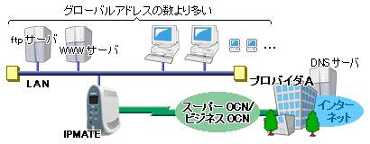 ただし、スーパーOCN/ビジネスOCNから割り当てられたグローバルアドレスの数より、端末の台数が多い場合について説明します。 この場合、NATを使用し、プライベートアドレスを各装置に割り当てます。