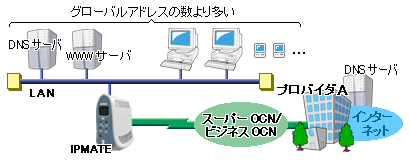 ただし、スーパーOCN/ビジネスOCNから割り当てられたグローバルアドレスの数より、端末の台数が多く、かつ、OCN側のDNSサーバとともに自分で用意したDNSサーバを使用する場合について説明します。 この場合、NATを使用し、プライベートアドレスを各装置に割り当てます。