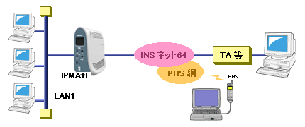 アクセスサーバ機能を利用することで、INSネット64を介した遠隔地の端末から、10BASE-Tポートに接続した端末のLANに参加させることができます。 アクセスサーバ機能を利用すると、LAN側ネットワークのIPアドレスを遠隔地の端末に割り当てることができます。 外出先などから、LAN上のサーバなどにアクセスすることが可能となります。