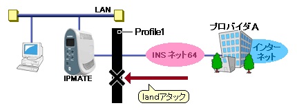 - 本商品では、landアタックに対するIPパケット・フィルタリングに使用するフィルタを、「Profile1」として既に用意しています。お買い求め時には、回線側に登録済みです。
