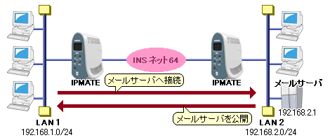 - LAN2側にあるIPMATEに「192.168.2.1のメールサーバを公開する」フィルタ定義を登録します。