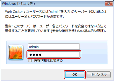 - ユーザー名に、「admin」、パスワードには、お客さまが設定されたパスワードを入力し、ログインしてください。