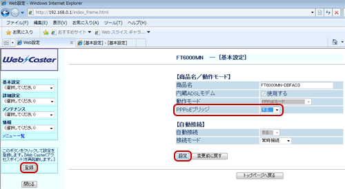 - 「PPPoEブリッジ」をするに変更し、設定を押下し、登録ボタンを押下してください。