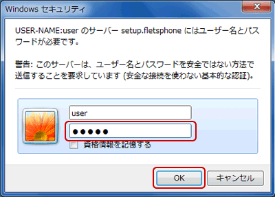 - ユーザー名に、「user」、パスワードには、お客さまが設定されたパスワードを入力し、ログインしてください。
