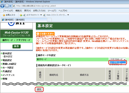 - 「動作モード」をルーターモードに変更し、下部にある「設定」を押下します。