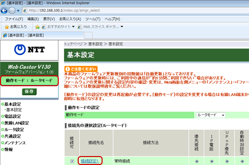 2.V130をルーターモードに変更する。