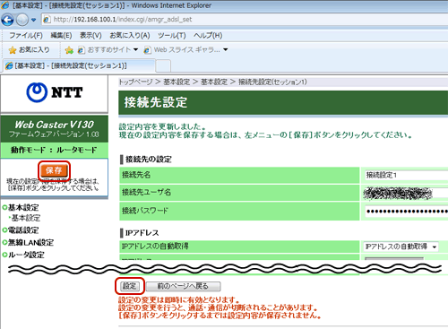 - 下部にある設定ボタンを押下した後に、左側にある保存ボタンを押下することで、V130に設定内容が保存されます。