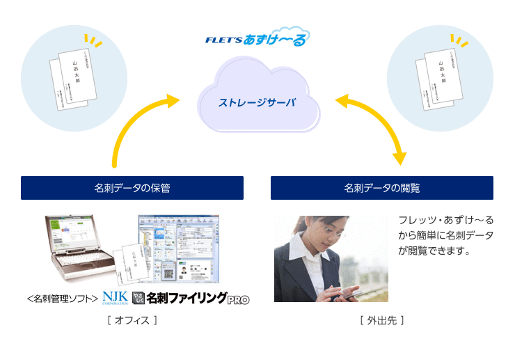 株式会社NTTデータNJK社製の名刺管理ソフト「やさしく名刺ファイリングPROv.15.0」から、名刺データをフレッツ・あずけ~るに直接アップロードして、簡単に閲覧できます。