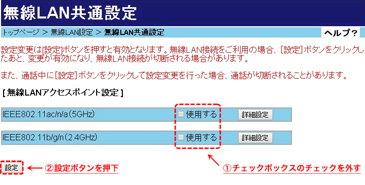 - 「無線LANアクセスポイント設定」欄で、停止したい周波数帯の「使用する」のチェックを外します。