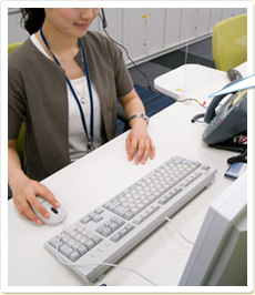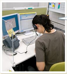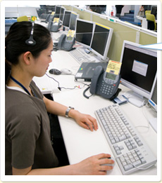 調査隊がサポートセンタを訪問したのは、平日の午前9時。ドアを開くと、広々としたフロアの中に、見渡す限りのデスクと人…すでにお客さまからの電話が入りはじめ、サポートセンタの1日が始まっていました。 電話の着信はランプで知らせる仕組みなので、ベルの音が鳴り響くこともなく、意外に静か。他の応対の妨げにならないよう徹底した配慮がされているようです。 それぞれのオペレータ(応対を担当する専門スタッフ)のデスクには、パソコンと電話機が用意されています。電話中でもキーボードやマウスを操作できるように、マイク付きのヘッドセットを頭に装着した姿が印象的です。 ![]() |