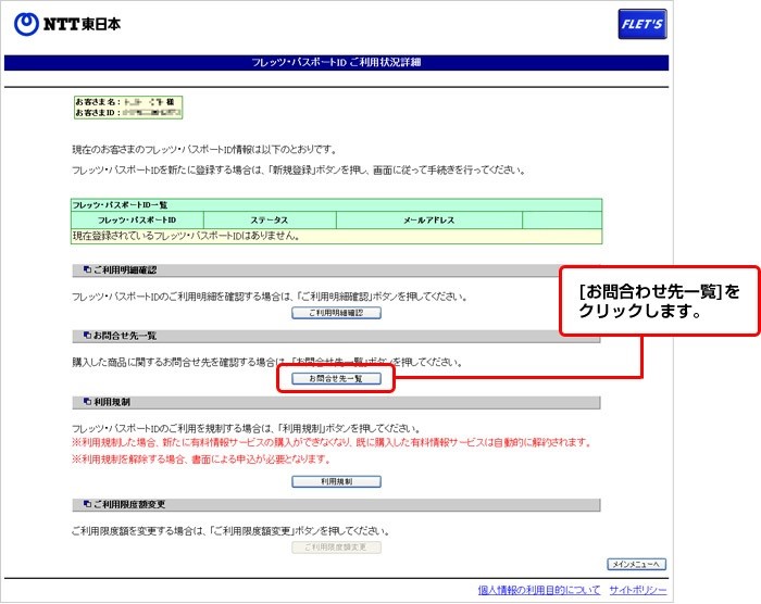 サービス申込受付ページのメインメニュー一覧から「フレッツ・パスポートID」の[詳細]を選択します。