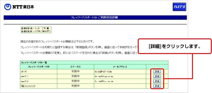 閲覧したいフレッツ・パスポートIDの「詳細」を選択