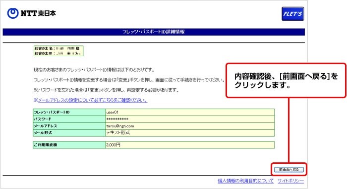フレッツ・パスポートIDの詳細情報を確認します。確認が終わったら、[前画面へ戻る]をクリックします。