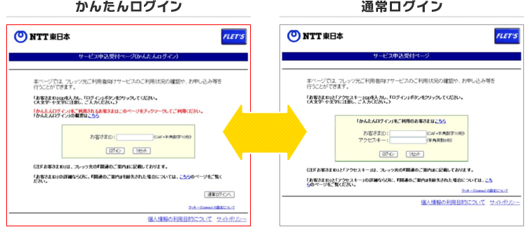 - かんたんログインは、フレッツ光のご契約者さまがサービス申込受付ページへログインする際に、お客さまIDのみでサービス申込受付ページへログインを可能とする機能です。