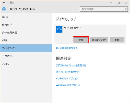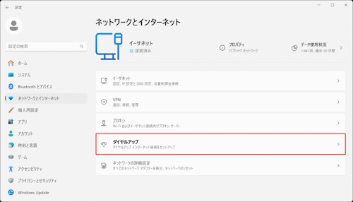 「ネットワークとインターネット」の項目内の『ダイヤルアップ』を選択します。