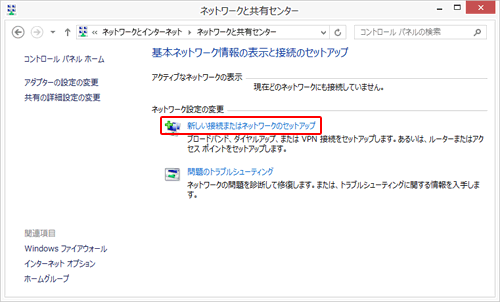「ネットワークと共有センター」の『新しい接続またはネットワークのセットアップ』を選択します。