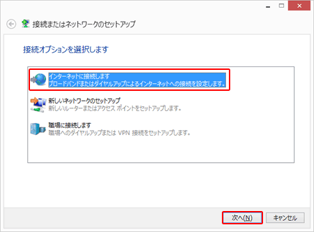 『インターネットに接続します』を選択した後、『次へ』を選択します。