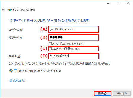 - (A) 『ユーザ名』欄に「guest@v4flets-east.jp」を入力します。(半角英数字)