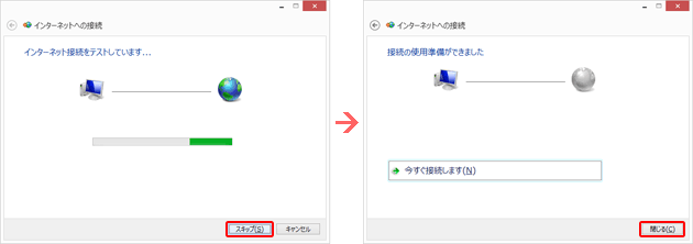 インターネット接続のテスト画面にて、『スキップ』を選択した後、『閉じる』を選択します。