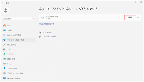 Windows 11では「ネットワークとインターネット」の項目内の『ダイヤルアップ』を選択、Windows 10/8.1/7/Vista では「ネットワークとインターネット」の項目内の『ネットワークの状態とタスク表示』を選択します。