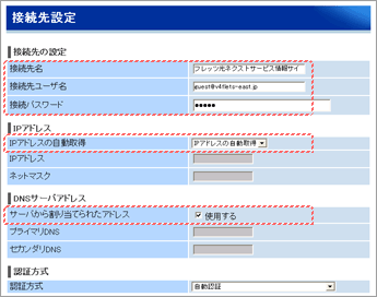 項目 設定内容 認証方式 PPPoE プロバイダ名等(任意) サービス情報サイト(NGN IPv4) ユーザ名 guest@v4flets-east.jp パスワード guest IPアドレス 自動取得 DNSサーバアドレス 自動取得 - DNSサーバアドレスは手動でも設定可能です。最新のDNSサーバアドレス一覧はこちら