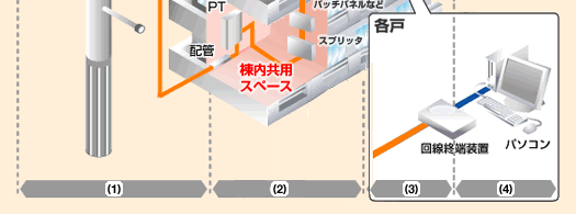 棟内の配管を利用して、「スプリッタ」または「パッチパネル等」から各戸まで光回線で接続します。各戸には「回線終端装置」を設置します。(1)はNTT東日本実施、(2)はお客さままたはNTT東日本実施となります。(設備状況により異なります。)配線に必要な配管は管理組合さま・オーナーさまにご用意いただきます。詳細については弊社営業担当者へご確認ください。