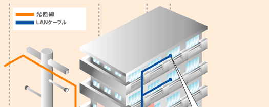 一般に「インターネット対応マンション」などと呼ばれる集合住宅で、棟内共用スペースと各戸の間があらかじめLANケーブルで接続されている場合、各戸の中に新たに機器を設置する必要はありません。新たに棟内にLAN配線を施工する場合は、管理組合さま・オーナーさまに用意していただく必要があります。配線に必要な配管は既存のものを利用するか管理組合さま・オーナーさまにご用意いただきます。