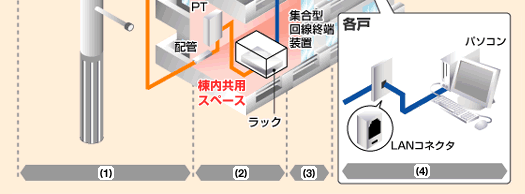 電柱から棟内共用スペースに光回線を引き込み、PT(Premises Termination)に接続します。棟内共用スペースとしては、電話用のMDF(主配線盤)が収納してある「MDF室」を利用するケースが多いです。