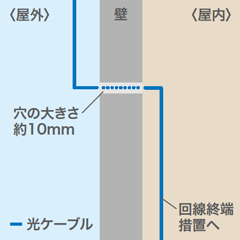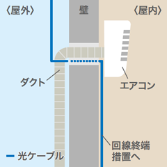 光ケーブルは、通常は電話用の配管を利用して部屋まで引き込みます。配管に空きがないときは、エアコンダクト(エアコン用の通気口)を利用したり、壁に穴を開けて引き込む場合もあります。
