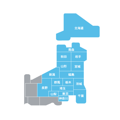 北海道・青森・岩手・秋田・宮城・山形・福島・茨城・栃木・群馬・埼玉・千葉・東京・神奈川・山梨・長野・新潟の各県