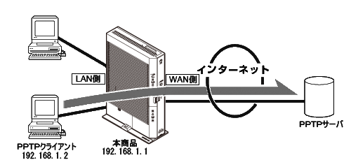 LAN側のPPTPクライアントの設定を実施しても、PPTPの接続が失敗する場合は、「利用例2」を参照し、本商品に静的IPマスカレードの設定を行ってください。