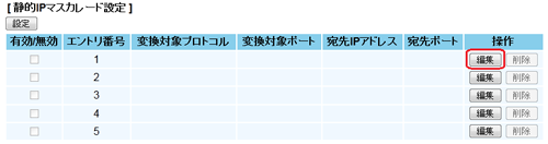 エントリが登録されます。 - 「静的IPマスカレード設定」-「静的IPマスカレード設定」に、入力した内容が追加されていることを確認する