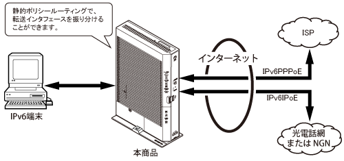 本機能は、ご契約のプロバイダがIPv6 PPPoE方式によるインターネット接続を提供している場合、LAN側に設定するプレフィックスの判別方法の設定、および「IPv6インターネット接続(IPv6 IPoE)サービス」または、「フレッツ・V6オプション」をご利用のお客様宛の通信の転送先を選択することが可能です。