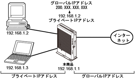 IPマスカレードとは、1つのグローバルIPアドレスを利用して、LAN内のプライベートIPアドレスを持つ複数のパソコンをインターネットに接続できる機能です。 IPマスカレードの場合は、WAN側からLAN側のパソコンのいずれかを指定してアクセスを開始することはできません。