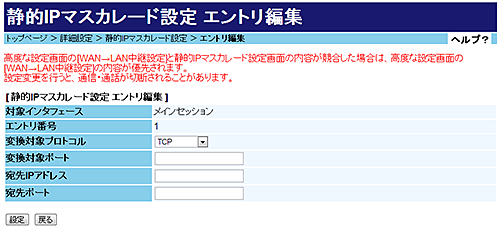 - 「静的IPマスカレード設定」-「静的IPマスカレード設定」に、入力した内容が追加されていることを確認する。