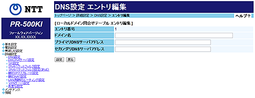 「ドメイン名」に設定したドメインを問い合わせる「セカンダリDNSサーバアドレス」を設定します。