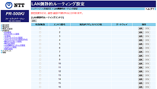 [LAN側静的ルーティング設定エントリ編集]