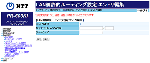 [LAN側静的ルーティング設定 エントリ編集]