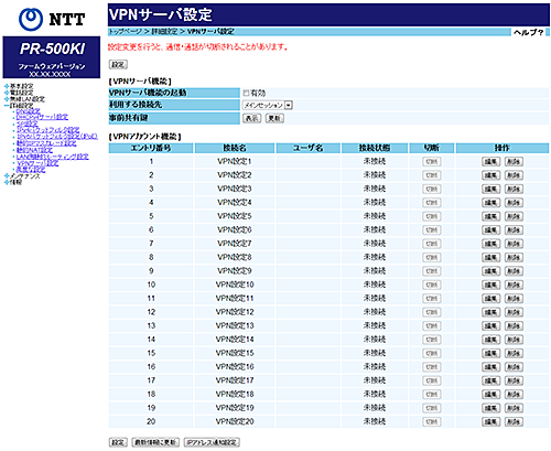 VPNサーバ機能の起動 (初期値:無効)