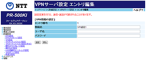 「VPNサーバ設定 エントリ編集」画面が表示されます。