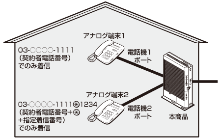※「本商品の設定」ページの[電話設定] — [内線設定]の [アナログ端末(電話機1)] / [アナログ端末(電話機2)] 画面で[電話番号設定]の[指定着信機能]にチェックし、[指定着信番号]に「1234」(指定着信番号)を入力します。