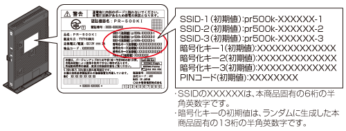 | 無線ネットワーク名(SSID-1) | pr500k-XXXXXX-1 (XXXXXXは本商品のWAN側のMACアドレスの下6桁) |