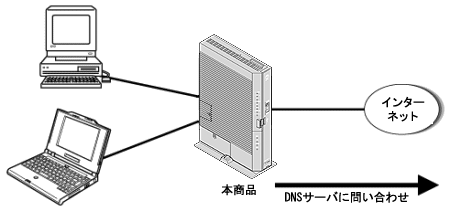 DNS Proxyとは、LAN上の各パソコンからのDNSの問い合わせパケットを受け取ると、インターネット上の本来のDNSサーバにフォーワーディングして問い合わせ、IPアドレスを各パソコンに回答する機能です。LAN上のパソコンは、本商品がDNSサーバとして動作しているように見えます。