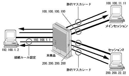 上記のような設定を行った場合には、[セッション2](WAN側)と本商品内のWebサーバ(LAN側、IPアドレスは'192.168.1.2')は、直接通信できます。