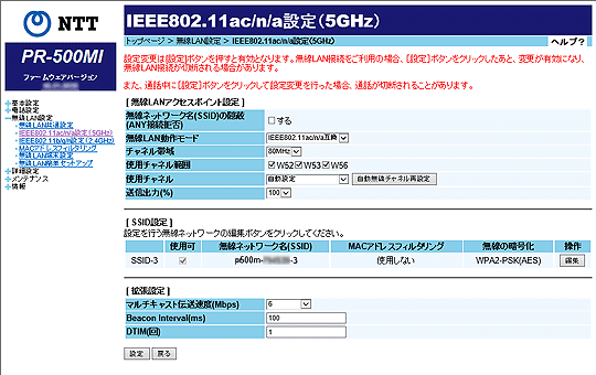- PR-500MI/RT-500MIの場合には、無線の暗号化のモードが「WPA-PSK(AES)」または、「WPA2-PSK(AES)」の場合のみIEEE802.11nによる高速通信が可能です。