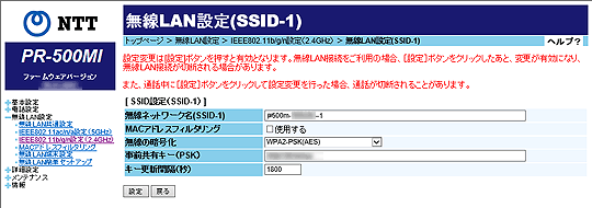 - PR-500MI/RT-500MIの場合には、無線の暗号化のモードが「WPA-PSK(AES)」または、「WPA2-PSK(AES)」の場合のみIEEE802.11nによる高速通信が可能です。